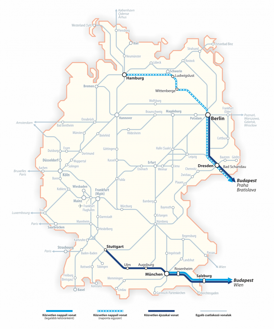 Budapestről Drezdán át Berlin és Münchenen át Stuttgart kényelmesen elérhető az éjszakai vonatokkal. Drezdába, Berlinbe és Hamburgba napi egyszer nappali vonat is jár, étkezőkocsival, akadálymentes utazási és kerékpárszállítási lehetőséggel.