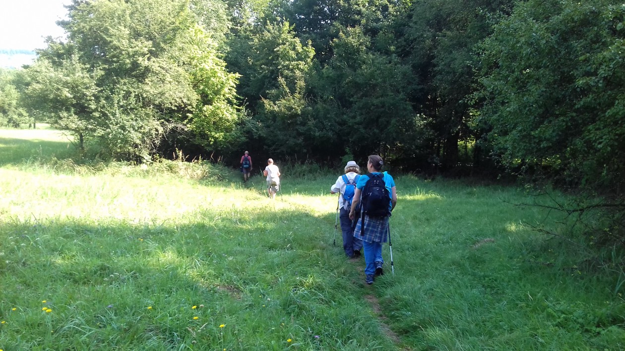 Ez a szakasz már a Visegrádi-hegység része. Váltakozó szinteken ereszkedtünk lefelé a hegyről, utunk tisztásokon keresztül ért el az első bélyegzőponthoz, a sikárosi erdészházhoz. Itt egy éles jobbfordulóval, letérve a széles aszfaltról, ismét erdős rész következett, majd változó szinteken, a Bükkös-patak medrét hídon keresztezve és egy erősebb ereszkedéssel, beértünk Pilisszentlászló házai közé. A végpont itt is a kocsma, ahol füzeteinket elláttuk pecsétekkel. A célfotó a főtéri templom melletti Szent László királyunk mellszobra. Következett megint az elválás, persze nem zokogva, de kissé morogva konstatáltuk, hogy két tagunk a nyári hőség ellenére továbbindult és a későbbi híradásokból megtudtuk: szerencsésen be is érkeztek a visegrádi kompkikötőhöz.