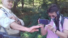 Kezdőkép ismét a szobor, aztán hamarosan emelkedős erdő és nem sokára, az út negyedénél már itt is az első bélyegzőpont a Pap-réti erdészháznál. Továbbindulva a Vízverés nyerge tisztáson emlékkő, innen nem messze van Urak asztala (594 m), és itt a térkép elhagyott katonai létesítményeket, légvédelmi rakéta osztály egységeket mutat, de most nem teszünk kitérőt. Az erdő az erős napocska ellenére nem forró, inkább hűs, nyugtató. A fák takarnak. Az Őr-hegy oldalában gyönyörű látvány a Duna kanyarja, balra fent valahol Prédikálószék, mögötte a Rám-szakadék, szemben velünk a folyó jobb (nekünk most a bal) partján Dömös házainak halvány foltja. Tovább ereszkedünk és hamarosan elérjük Visegrád körzetét. Ez azért látszik meg azonnal, mert innentől az erdei utak szegélyezettek, karbantartott, murvás kővel kirakottak, mindenhol fából készült szemetes tárolók. Beérünk a civilizált környezetbe, az utakon és parkolókban hatalmas a forgalom. Mi becélozzuk Nagyvillám kilátó tornyát és megejtjük a pecsételés megszokott rituáléját. Rövid pihenő után ismét a Kéken, a Fellegvár parkolójánál egy pillantás a várba igyekvőkre, majd itt érjük el a Dél-nyugati gerincen leereszkedő utat, ami néhol már igencsak meredek (úgy látszik: fáradunk, mert ez az út most megviseli a lábat). A faluban kiérünk a révhez a partra, ahol visszatekintve a várra, pecsételünk. A következő képen már látszik a busz is, amivel Szentendrén át érjük majd el a MÁV-HÉV-et. De ekkor jött a tövis…
