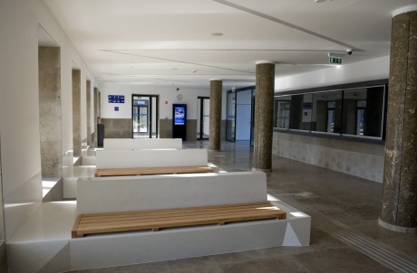 A homlokzati kerámiaburkolat helyére hőszigeteléssel ellátott csiszolt mészkőburkolat került, a bejárathoz kapcsolódó falakon szürkés árnyalatú texturált műkőburkolattal és arra épített kültéri órával. A beltérben kő- és faburkolatú padokkal, valamint süllyesztett világítással alakítottak ki kortárs hangulatot. Fehér dekorbeton ablakkeretezés fogja össze a földszinti ablaksort, az emeleti nyílásoknál műkő árnyékoló pengék jelennek meg. Szintén műkő szegélyelem emeli ki az épület fő karakterét adó födémlemez könnyed lebegését. A főbejárat automata tolóajtós portállal készült.