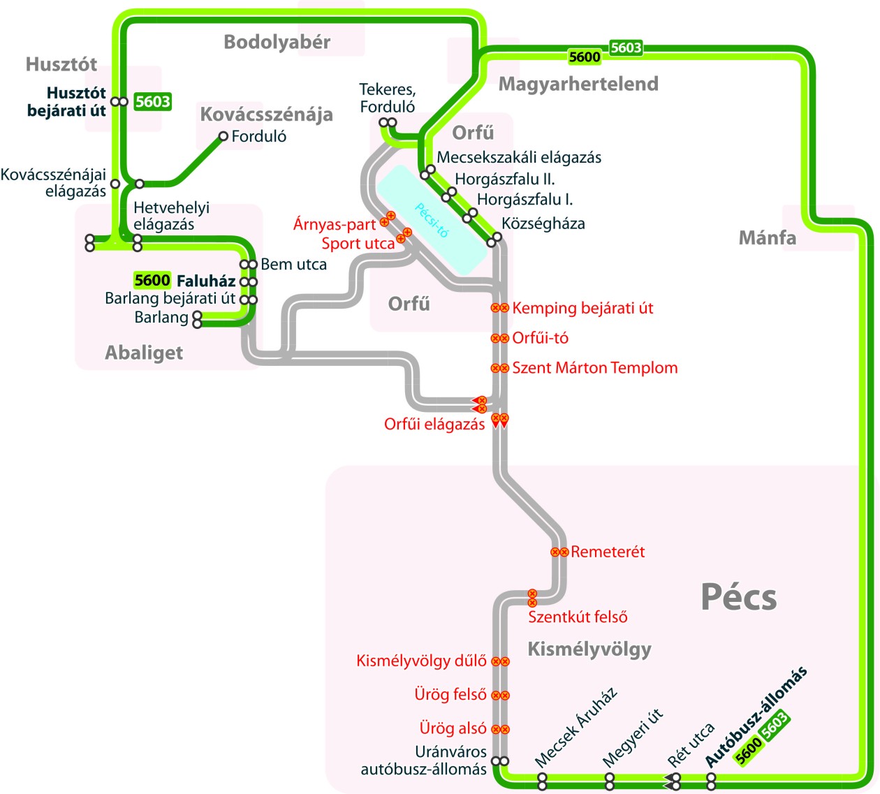 A táblázatban szereplő autóbuszok mindkét irányban a Pécs – Magyarszék – Orfű – Husztót – Abaliget útvonalon át közlekednek.