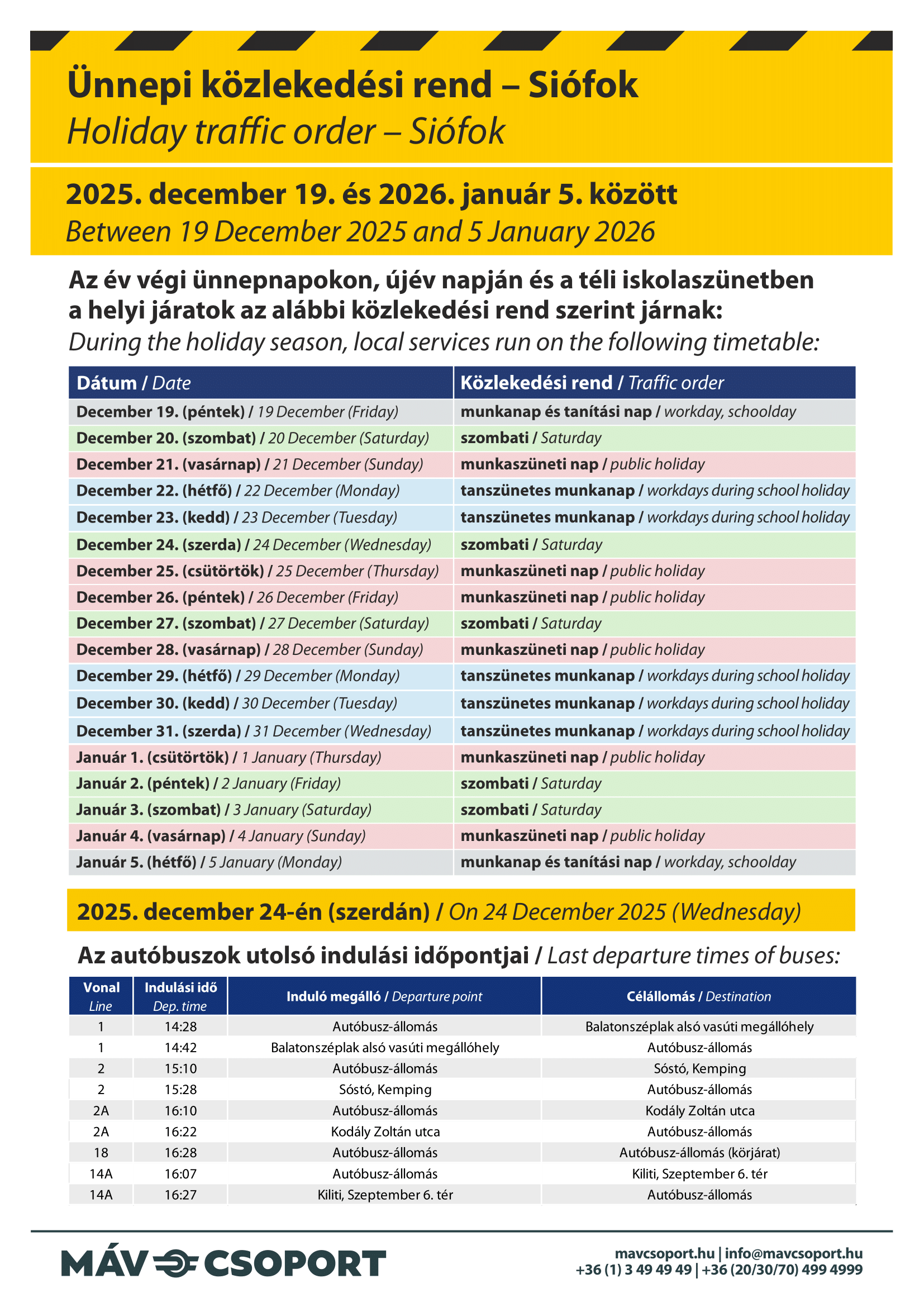 2025. december 19. és 2026. január 5. között az év végi ünnepnapokon, újév napján és a téli iskolaszünetben a helyi járatok az alábbi közlekedési rend szerint járnak: