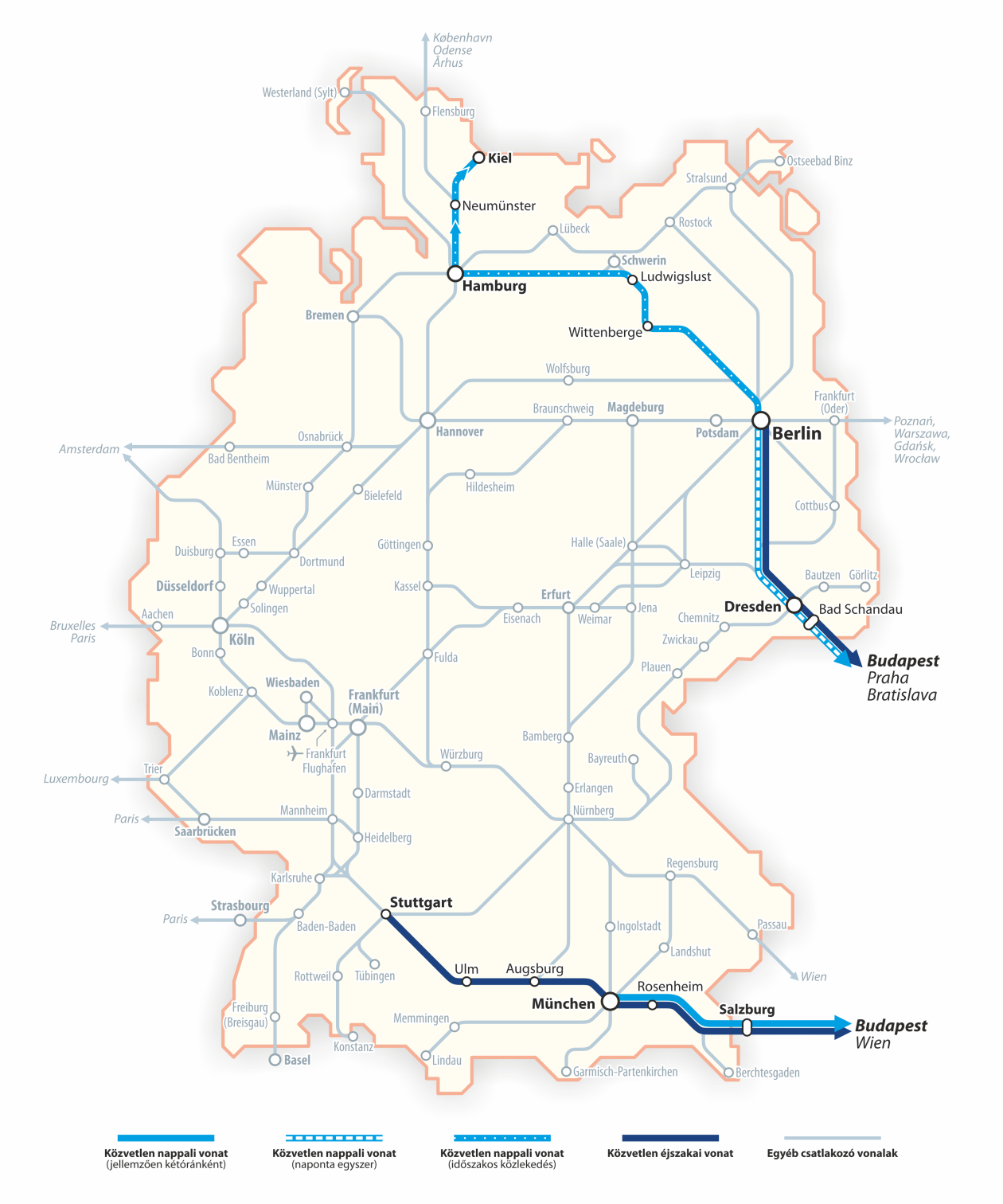 Budapestről Drezdán át Berlin és Münchenen át Stuttgart kényelmesen elérhető az éjszakai vonatokkal. Drezdába, Berlinbe és Hamburgba napi egyszer nappali vonat is jár, étkezőkocsival, akadálymentes utazási és kerékpárszállítási lehetőséggel.