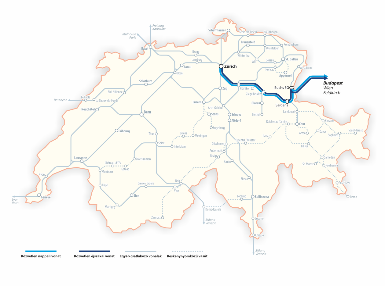 Magyarországról Zürichbe – ahonnan egy átszállással elérhető valamennyi fontos svájci nagyváros éjszaka közlekedik közvetlen vonat. Emellett a nappali zürichi utazásra naponta többször is van lehetőség bécsi átszállással.